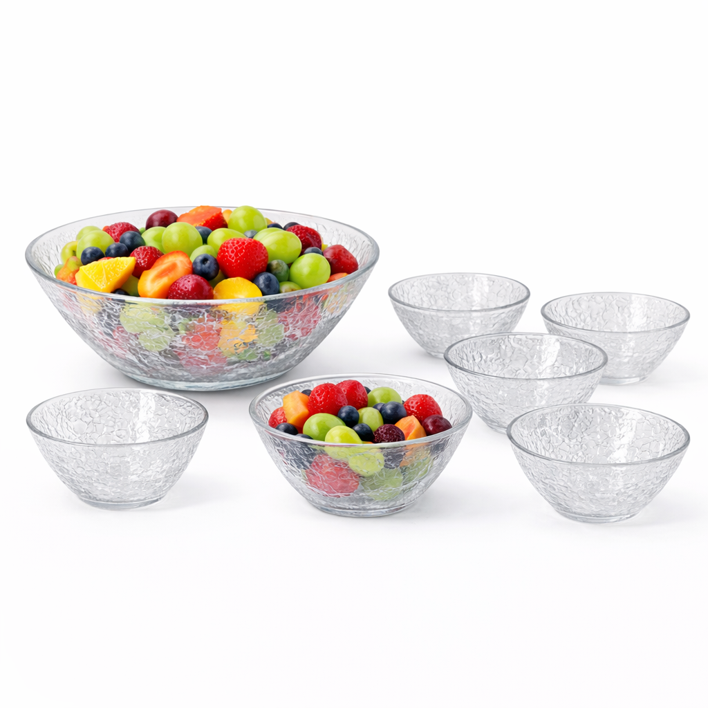 Juego de macedonia de cristal. Compuesto por un bowl grande y 6 pequeños. Marca Santa Ana.